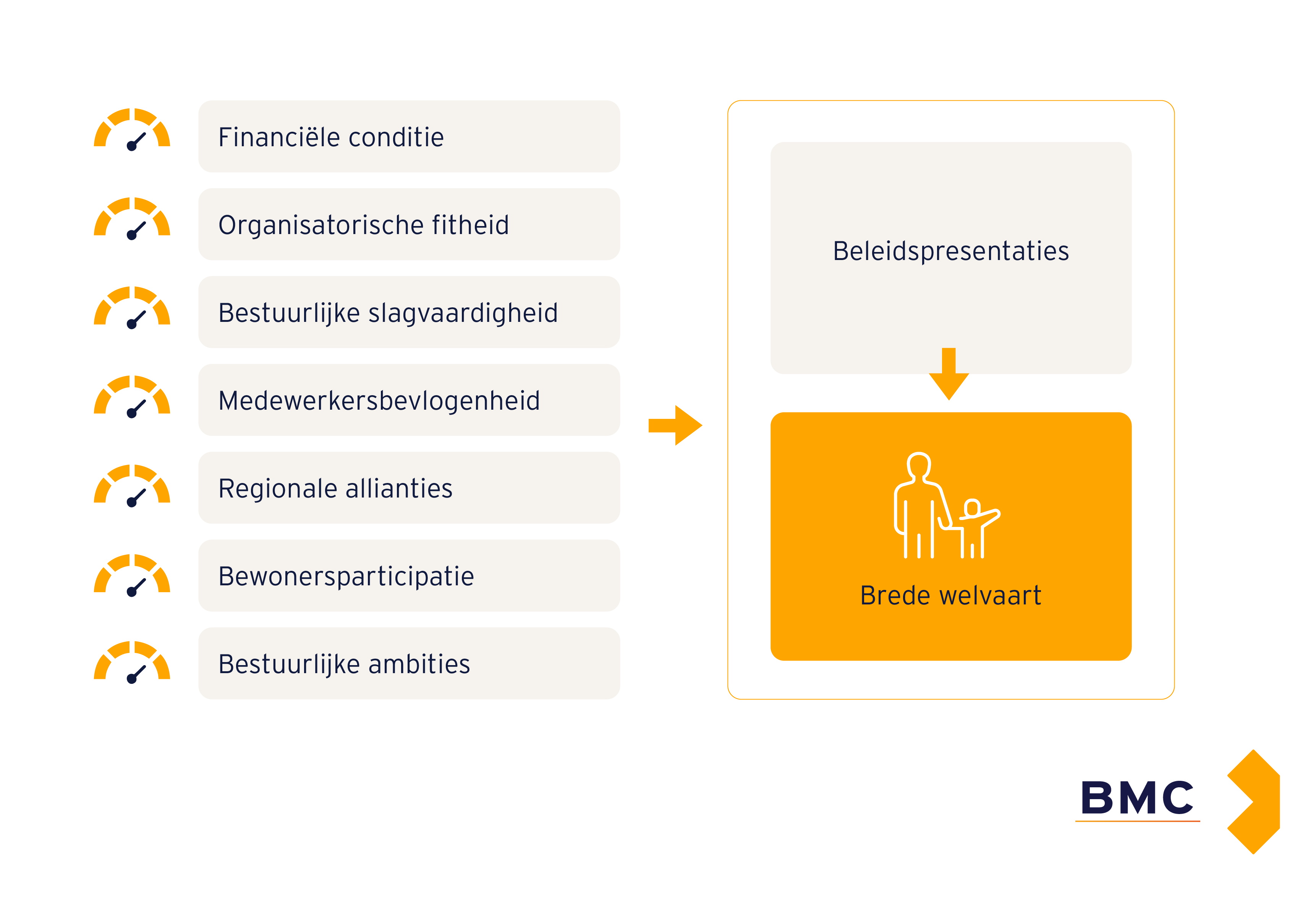 BMC heeft ruim 35 jaar ervaring in het onderzoeken van en adviseren over bestuurskracht. Wij begrijpen de unieke dynamiek van de publieke sector als geen ander en bieden concrete oplossingen om uw bestuurskracht duurzaam te versterken. Concreet hebben we gemeenten en provincies het volgende te bieden: