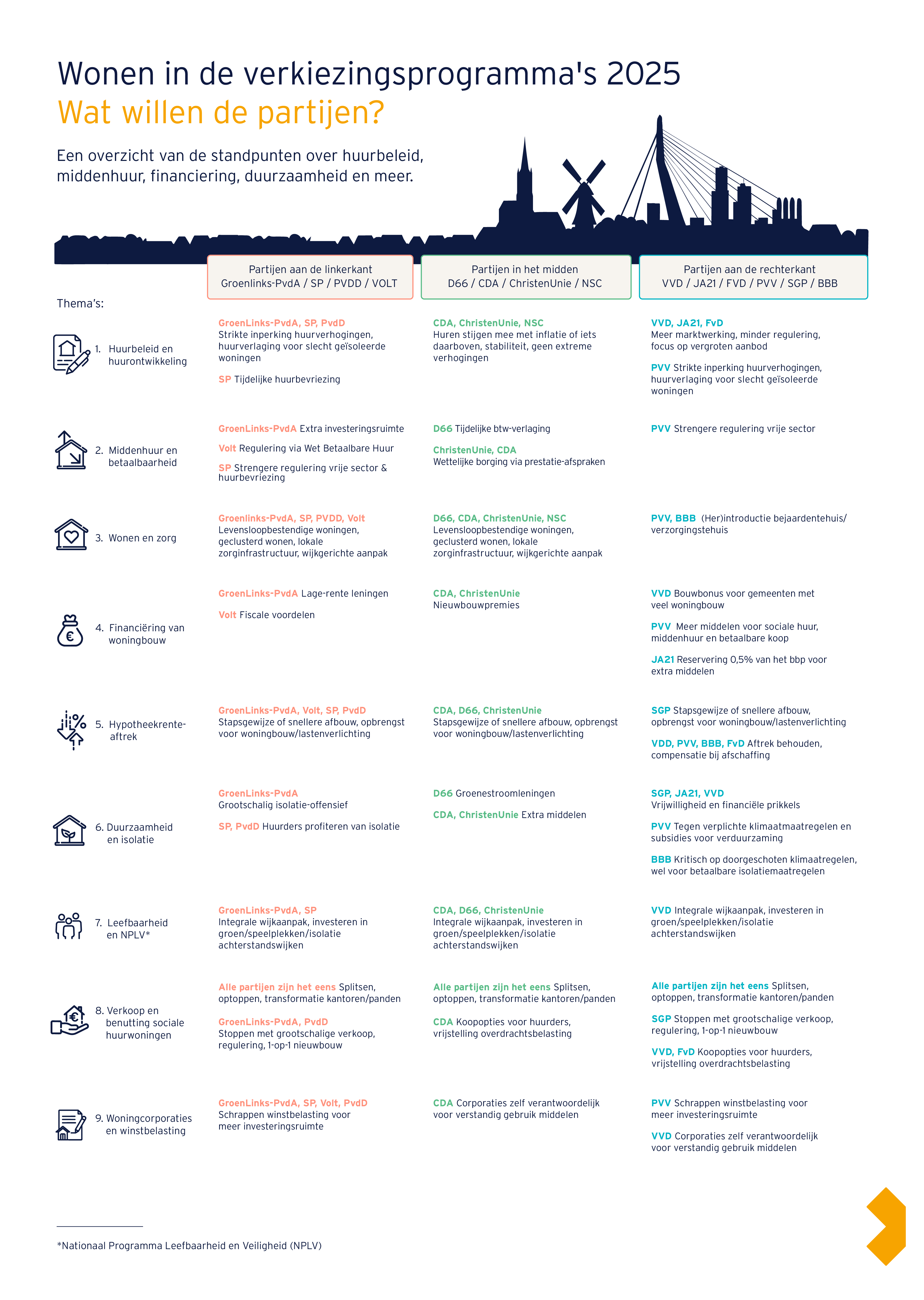 Een overzicht van de standpunten over huurbeleid, middenhuur, financiering, duurzaamheid en meer.